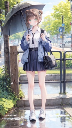 1girl, skirt, solo, umbrella, single hair bun, phone, holding, outdoors, hair bun, shoes, bag, jacket, shirt, transparent, sneakers, cellphone, white shirt, brown hair, holding phone, blush, standing, holding umbrella, reflection, belt, transparent umbrella, bangs, shoulder bag, white footwear, smartphone, open clothes, blue jacket, green eyes, fence, open jacket