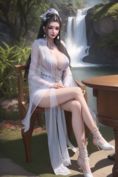 ultra realistic 8k cg, flawless, clean, masterpiece, professional artwork, famous artwork,cinematic lighting, cinematic bloom, perfect face, beautiful face,shenfengYueYao,1girl, solo,dress,armor,sitting,crossed legs,hair bun,fur coat,fur trim,tiara,forehead mark,facial mark,torogao,smile,red lips, breasts,large breasts,cleavage,jewelry,earrings,hair ornament,(outdoors:1.4),water,waterfall,butterfly,flower,long hair,realistic, looking at viewer,boots,<lora:shenfengYueYao_20240103113544-000004:0.7>,