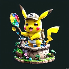 (Fantasy Micro Architecture Island) Kawaii Pikachu Painter changes body colors to match his vibrant paintings. Rendered in an animated style, the focus is on the chameleon's adorable big eyes and intricate patterns on his body. Monochrome background