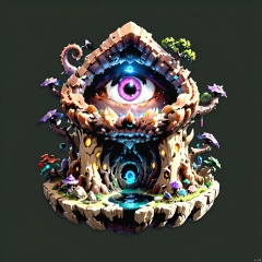 (Fantasy Micro Architecture Island) Floating Circle ((One Eye)), Dungeons & Dragons BEHOLDER Monster, located in a spotlighted cavern, surrounded by void magic