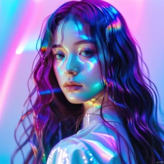 1girl, solo, long wavy hair, flowing rainbow colored holographic background, portrait, holographic, iridescent, vaporwave, fluid, niji style, realistic