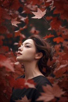 A girl with short black hair,Low Angle,(hongye:1.3),Fallen leaves,<lora:hongye:0.7>,