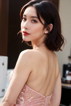 マスターチーフ PHOTOREALISTIC REALISTIC,masterpiece,best quality,highres,ultra detailed,8k,1woman,upper body,from behind,backless dress, looking back at viewer,makeup,lipstick,indoors,<lora:mengziyiAlexnsfw80:0.6>