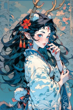(masterpiece:1.2),best quality,highres,extremely detailed CG,perfect lighting,8k wallpaper,anime,comic,game CG,1girl,solo,rabbit tail,blue eyes,hair ornament,looking at viewer,chinese clothing,hanfu,hair flower,antlers,flower,simple background,facial mark,long sleeves,upper body,hand up,spot color,whisker markings,wide sleeves,from side,tassel,closed mouth,blush,hand on own chin,bangs,sash,parted lips,<lora:FF_20231230024508-000005:1>,