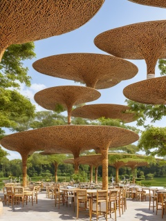 Best quality,masterpiece,ultra detailed,complex architecture,RAW simulation photos,art station trends,wide-angle photos,<lora:20240102-1704177466587:0.6>,restaurant,made of rattan,granule,aerial view,a field full of yellow rape flowers,in spring,somewhere beyond the mist / blue sky and white clouds,rattan gazebo,