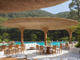 Best quality, masterpiece, ultra detailed, a giant building near a hillside, complex architecture, butterflies, vines, moss, exquisite architecture, endless pine forests, snow scenery, RAW simulation photos, art station trends, wide-angle photos, depth of field, perfect compositiona pavilion made of rattan,Swimming pool,outdoor sofa,tropical.,Summer Noon,montage effect,<lora:20240102-1704177466587:0.6>,restaurant,
