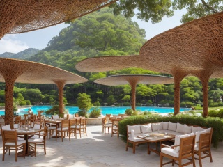 Best quality, masterpiece, ultra detailed, a giant building near a hillside, complex architecture, butterflies, vines, moss, exquisite architecture, endless pine forests, snow scenery, RAW simulation photos, art station trends, wide-angle photos, depth of field, perfect com,positiona pavilion made of rattan,Swimming pool,outdoor sofa,tropical.,Summer Noon,montage effect,<lora:20240102-1704177466587:0.6>,restaurant,