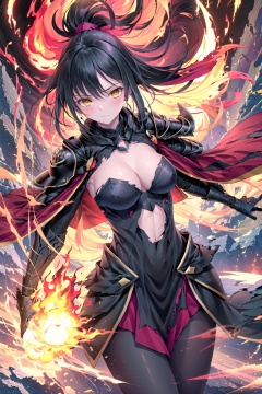 (black obsidian armor:1.17),(exquisite engraved),1 girl,Gray skin,(Long black hair),ponytail,hair cord,(cowboy shot),(cool),cleavage,(detailed light),(an extremely delicate and beautiful),volume light,best shadow,Depth of field,dynamic angle,Oily skin,(torn red cloak<(Powerful explosion and flame)>),(Grey fog, ruins in fog),(yellow carved),(explosion ruins, flying stones),(Velocity line:1.2),(Powerful explosion background),<lora:光崎画风+光影与色彩特化:0.7>,