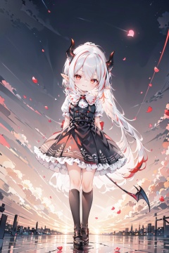 (highres),(masterpiece),Red scene,(Red petals floating in the air:1),(In the sky),(night),(full body, wide shot, panorama:1.3),backlighting,Black and red hair, Orange red eyes,Sparkling eyes, looking down,from below, long hair,hair between eyes,ponytail,streaked hair,messy hair, floating hair,demon wings, evil,1girl, (loli), (petite),gothic lolita, solo,black knee socks,An evil smile,fang,head tilt,arms behind back,pointy ears,heart tail,devil horns,(fly),
