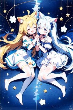 long sleeves, sleeves past wrists, closed mouth, multiple girls, 2girls, long hair, smile, animal ears, ahoge, grey eyes, detached sleeves, thighhighs, dress, closed eyes, very long hair, puffy sleeves, bare shoulders, white hair, white sleeves, white dress, white shirt, crop top, bangs, hair between eyes, hair ribbon, shirt, two side up, sleeves past fingers