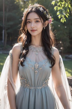 masterpiece,best quality,ultra high res,photorealistic,upper body,1girl,smile,Elven-inspired gown with flowing chiffon and intricate embroidery,mottled sunlight,simple background,