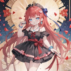 1 girl, black nails,blue eyes, bangle, skirt, hair ribbon,headdress off, long hair, look at the audience, nail polish, , red Nails, ribbon, standing, solo, petals (symbol) , petal earrings, petal hair ornaments, petal necklace, petal pie, petal pattern, petal background, toenail Polish, very long hair, wrist ribbon, wrist band