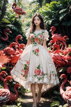Surrealist photography, full body, (1 girl), long curly hair, embroidered dress, female focus, Petina Hicks, realistic characters, light blue Andiro, (flamingo), roses, balloons, surrounded by birds, forest background, masterpiece, detailed details, depth of field,FeiNiao