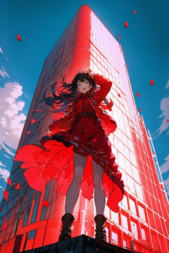 <lora:tiao1:0.8>,1girl, solo, long hair, sky, from below, black hair, outdoors, day, blue sky, wind, standing, cloud, red dress, building, red jacket, skirt, long sleeves, boots, arm up, dress, jacket, full body, parted lips, petals, masterpiece,best quality,highres,8k uhd,
