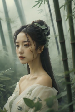 zhu,a girl,bamboo trees,long hair, fog in the air,Off Shoulder,The foreground is a blurry bamboo leaf,sideways , Detail