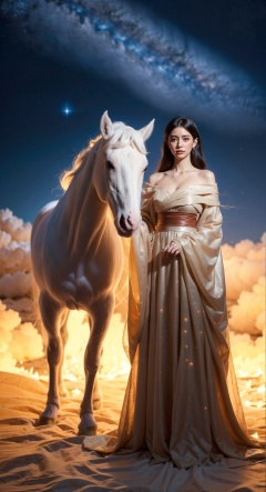 1 girl,(upper body:1.2), standing next to a hot white horse surrounded by starry sky. This white horse is emitting flames, which seem to come from the stars in the background. The girl was wearing a flowing dress, which contrasted sharply with the surrounding environment, the complex in, and Rutkowski Midtravel artworks of Greg, a girl and her burning horse under the starry sky. Popular on ArtStation and CGSociety.
