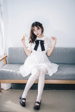 1girl named aki,1girl, dress,_style dress, sitting, pantyhose, long hair, white footwear, brown hair, shoes, holding, full body, glasses, box, hair ornament, high heels, black hair, flower, bow, lolita fashion, white pantyhose, platform footwear, hand up,see-through, ribbon, = good anatomy, good proportions, shapely body,