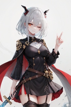 1girl, solo, horns, shushing, grey hair, skull, looking at viewer, finger to mouth, black dress, long sleeves, thigh strap, holding, one eye closed, breasts, dress, index finger raised, thighhighs, hair intakes, orange background, bangs, sword, cape, short hair, weapon, hair between eyes, smile, medium breasts, belt, simple background