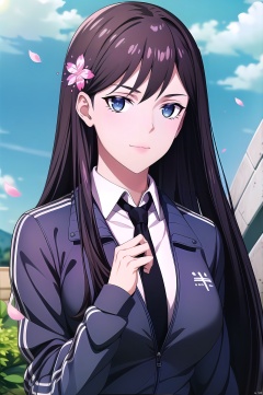 Sunrong, 1girl, solo, hair ornament, blue eyes, long hair, necktie, flower, hair flower, black hair, sky, petals, letterboxed, cherry blossoms, day, cloud, black necktie, blue sky,nice hands, perfect balance, looking at viewer, closed mouth, (Light_Smile:0.3), official art, extremely detailed CG unity 8k wallpaper, perfect lighting, Colorful, Bright_Front_face_Lighting, White skin, (masterpiece:1), (best_quality:1), ultra high res, 4K, ultra-detailed, photography, 8K, HDR, highres, absurdres:1.2, Kodak portra 400, film grain, blurry background, bokeh:1.2, lens flare, (vibrant_color:1.2), professional photograph, (narrow_waist), dark studio, , Sunrong