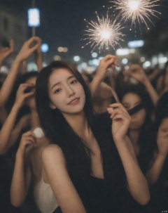 In the square, fireworks are in the sky, colorful lights, and lively crowds,