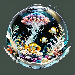 (black and white background: 1.5) (fantasy micro architecture: 1.5) undersea coral (venus bubble: 1.3) and alien fish, ocean bubble effect