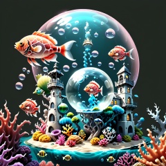 (Fantasy Micro Architecture Island) Underwater Coral (Venus Bubble: 1.3) and Alien Fish, Ocean Bubble Effect, Monochrome Background