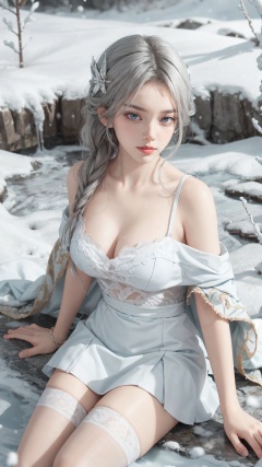 1girl,solo, head ornament,white stockings, ,,,,,,,,,,,masterpiece, best quality, official art, extremely detailed CG unity 8k wallpaper, Light and shadow special effects, shadow, Flowing light and shadow, falling_snow, snowing, shawl, white shawl, cleavage,,,,,,,, cold,expiration,