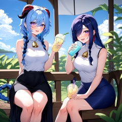 shenhe,genshin impact,shenhe \(genshin impact\),multiple girls,ganyu \(genshin impact\),blue hair,2girls,long hair,horns,smile,looking at viewer,purple eyes,ahoge,bangs,sleeveless,holding,sitting,alternate costume,black skirt,tassel,bell,breasts,parted lips,braid,cup,hair over one eye,hairband,blue eyes,white shirt,skirt,plant,goat horns,earrings,jewelry,slime \(genshin impact\),feet out of frame,tassel earrings,open mouth,cloud,shirt,neck bell,dress,day,sky,very long hair,outdoors,sleeveless shirt,holding cup,medium breasts,sidelocks,braided ponytail,contemporary,eyes visible through hair,flower,<lora:shenhe_v10_lora:1>,, masterpiece, best quality
