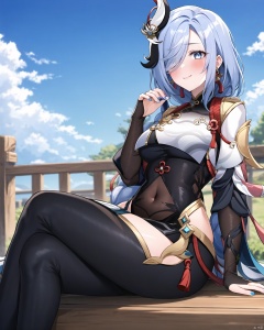 shenhe, genshin impact, 1girl, shenhe \(genshin impact\), solo, hair over one eye, blue eyes, , long hair, , blue nails, covered navel, looking at viewer, sitting, hair ornament, hip vent, tassel, bodysuit, braid, sky, smile, clothing cutout, blush, blue sky, gloves, black bodysuit, outdoors, jewelry, braided ponytail, nail polish, day, very long hair, earrings, bangs, puffy sleeves, thighs, closed mouth, tassel earrings, black gloves, shenhe,<lora:EMS-257384-EMS:0.900000>