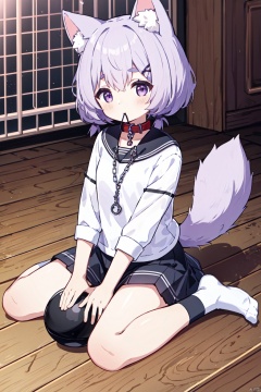 bone, animal ears, 1girl, tail, dog ears, dog tail, solo, ball, purple hair, pet bowl, collar, soccer ball, mouth hold, chain, sitting, leash, shirt, dog girl, looking at viewer, wariza, purple eyes, animal collar, bangs, black shirt, socks, food, short hair, bowl, thick eyebrows, twintails
