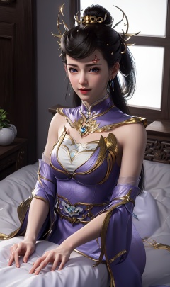 masterpiece,(best quality),3d,official art, extremely detailed cg 8k wallpaper,((crystalstexture skin)), (extremely delicate and beautiful),highly detailed,1girl,solo,long hair,headwear,(sitting,sit_down),(black_hair),((dress,skirt)),, (chinese_clothes),((upper body)),sweet smile, (medium breasts),((hair_ornament)),(sunshine, indoor,(bed)),((looking_at_viewer)),((Facing the camera)),, <lora:hipoly3DModelLora_v10:0.3>