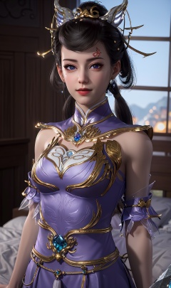masterpiece,(best quality),3d,official art, extremely detailed cg 8k wallpaper,((crystalstexture skin)), (extremely delicate and beautiful),highly detailed,1girl,solo,long hair,headwear,(standing),(black_hair),((dress,skirt)),, (chinese_clothes),((upper body)),sweet smile, (medium breasts),((hair_ornament)),(sunshine, indoor,(bed)),((looking_at_viewer)),((Facing the camera)),, <lora:hipoly3DModelLora_v10:0.3>