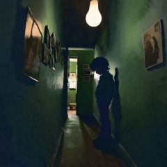 <lora:loneliness_xl_v2:0.8>,The image portrays a dimly lit corridor or hallway. On the left side, there's a wall adorned with numerous framed photographs, each displaying different individuals. The photographs are attached to the wall using a green adhesive. The corridor itself is painted in a muted green color, and there's a solitary light bulb hanging from the ceiling, casting a warm glow. On the right side of the image, a silhouette of a person, possibly a child, is seen standing near the wall, looking downwards. The person appears to be wearing a blue shirt and dark pants. The overall ambiance of the image is mysterious and evokes a sense of nostalgia or reflection.