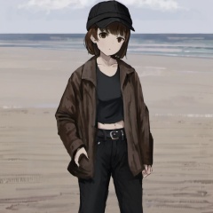 <lora:loneliness_xl_v2:0.8>,,a person standing on a beach with a hat on their head and a jacket on their shoulders and a black shirt on, 1girl, solo, looking_at_viewer, short_hair, bangs, brown_hair, shirt, hat, hair_between_eyes, closed_mouth, standing, cowboy_shot, open_clothes, pants, coat, black_shirt, expressionless, black_pants, hands_in_pockets, beanie