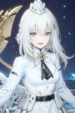 masterpiece, best quality, incredibly absurdress, highres, high detail eyes,1girl,solo,hair between eyes,blush,masterpiece,soft tender eyes,best quality,white hair,grey eyes,long hair,cosmos background,planets,cowboy shot,liv,wings,white coat,hat,smile,from above,close up,open mouth