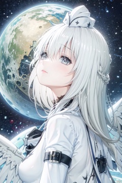masterpiece, best quality, incredibly absurdress, highres, high detail eyes,1girl,solo,hair between eyes,blush,masterpiece,soft tender eyes,best quality,white hair,grey eyes,long hair,cosmos background,planets,cowboy shot,liv,wings,white coat,hat,from side,looking up,worried_expression,from above,