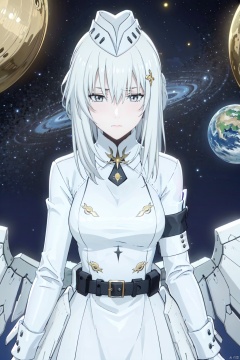 masterpiece, best quality, incredibly absurdress, highres, high detail eyes,1girl,solo,hair between eyes,blush,masterpiece,soft tender eyes,best quality,white hair,grey eyes,long hair,cosmos background,planets,cowboy shot,liv,mechanical wings,white coat,hat,looking up,worried_expression,from above