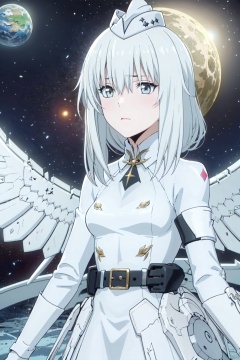 masterpiece, best quality, incredibly absurdress, highres, high detail eyes,1girl,solo,hair between eyes,blush,masterpiece,soft tender eyes,best quality,white hair,grey eyes,long hair,cosmos background,planets,cowboy shot,liv,mechanical wings,white coat,hat,looking up,worried_expression,