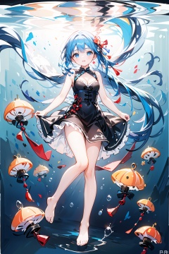 1girl, long hair, dress, underwater, solo, barefoot, black dress, very long hair, breasts, blue hair, blue eyes, jellyfish, cleavage, bubble, looking at viewer, bangs, coral, bare legs, sleeveless, full body, medium breasts, air bubble, fish