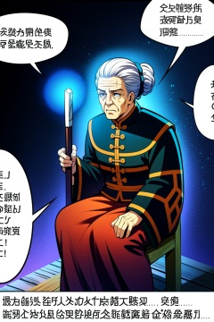Sanshikongbu, 1girl, solo, long sleeves, holding, sitting, white hair, hair bun, speech bubble, single hair bun, staff, holding staff, chinese text, old, old man, old woman, wrinkled skin8K,HDR,high resolution,(Masterpiece :1.3),(best quality :1.2),high quality,high detail,blurry background,
