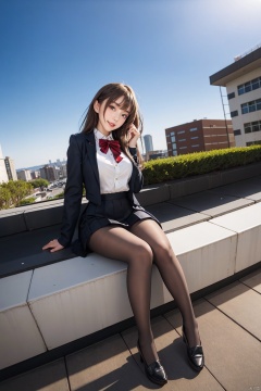 (best quality), ((masterpiece)), (highres), illustration, original, extremely detailed, 1girl, solo, pantyhose, long hair, solo, school uniform, skirt, black pantyhose, falling petals, hime cut, smile, open mouth, very long hair, , zettai ryouiki, navel, full body, from below, rooftop, sky, black_loafers, , black hair, sitting, fisheye, wind_lift, luyijiushi, 1 girl,<lora:EMS-72397-EMS:0.400000>