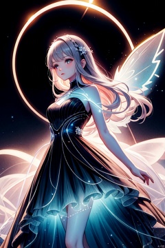 Best quality, 8k, cg,A girl formed by light,solo,glowing,black_background,light,A dress formed by light,starry_background
