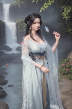 ultra realistic 8k cg,flawless,clean,masterpiece,professional artwork,famous artwork,perfect face,beautiful face,best quality,full_shot,absurdres,1girl,solo,hanfu,dress,standing,bare shoulders,facial mark,forehead mark,hair bun,hair rings,chinese clothes,sparkle,torogao,smile,makeup,red lips,breasts,large breasts,jewelry,earrings,hair ornament,(outdoors:1.4),water,waterfall,butterfly,flower,long hair,realistic,looking at viewer,high heels,<lora:shenfengJ_20240105120823-000004:0.7>,