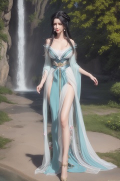 ultra realistic 8k cg,flawless,clean,masterpiece,professional artwork,famous artwork,perfect face,beautiful face,best quality,full_shot,absurdres,1girl,solo,hanfu,dress,standing,bare shoulders,facial mark,forehead mark,hair bun,hair rings,chinese clothes,sparkle,torogao,smile,makeup,red lips,breasts,large breasts,jewelry,earrings,hair ornament,(outdoors:1.4),water,waterfall,butterfly,flower,long hair,realistic,looking at viewer,high heels,<lora:shenfengJ_20240105120823-000004:0.7>,