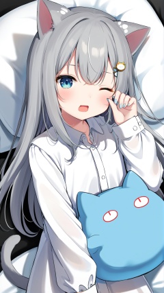 artist(甘城なつき),Nachoneko,1girl,shirt,animal ears,one eye closed,cat ears,tail,cat tail,sleeves past wrists,solo,white shirt,dress shirt,cat girl,collared shirt,long hair,hair ornament,long sleeves,blue eyes,bangs,grey hair,open mouth,hand up,hair between eyes,romaji text,nail polish,pillow,looking at viewer,fang,twitter username,blush,;o,hairclip,rubbing eyes,