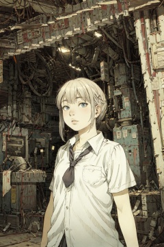 8k,absurdres, highres, ultra detailed, masterpiece, sharp shading,under,Tatsuyuki1girl,kid,abandon staion,school uniform,monocolor,gaint machine,(obsolete machine:1.3),upper body, (solo:1.2),1girl,masterpiece,<lora:Tatsuyuki Tanaka-000009:0.7>  <lora:Migunov2:1> <lora:GoodHands-vanilla:1>