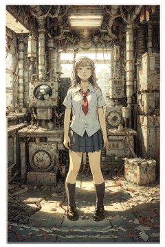 8k,absurdres, highres, ultra detailed, masterpiece, sharp shading,under,Tatsuyuki1girl,kid,abandon staion,school uniform,monocolor,gaint machine,(obsolete machine:1.3),upper body, (solo:1.2),1girl,masterpiece,<lora:Tatsuyuki Tanaka-000009:0.7>  <lora:Migunov2:1> <lora:GoodHands-vanilla:1>