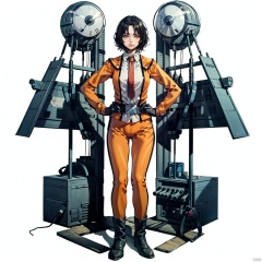 (masterpiece:1.3),(the best quality:1.2),(super fine illustrations:1.2),(Masterpiece),high quality,high detail,(white background:1.2),looking at viewer,(SOLO:1.4),outline,simple background,fullbody,,  belt,jacket,helmet,boots,uniform,military uniform,collar,choker,logo,gloves,shirt,necktie,orange jacket,white shirt,black gloves,suit,black footwear,orange pants,leggings,emblem,pants,armor,bodysuit,belt pouch,