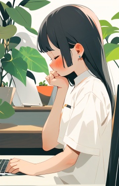 bp_ch, 1girl, solo, black hair, closed eyes, plant, shirt, computer, long hair, blush, laptop, earrings, jewelry, upper body, white shirt, leaf, profile, short sleeves, hand up, sitting, white background