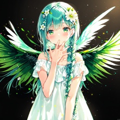 artist(roha), roha, , 1girl, solo, hair ornament, flower, braid, hair flower, dress, long hair, wings, looking at viewer, hair over shoulder, bare shoulders, white dress, bangs, blush, off shoulder, hand up, bug, white flower, upper body, parted lips, off-shoulder dress, aqua eyes, black background, green eyes, collarbone, green wings